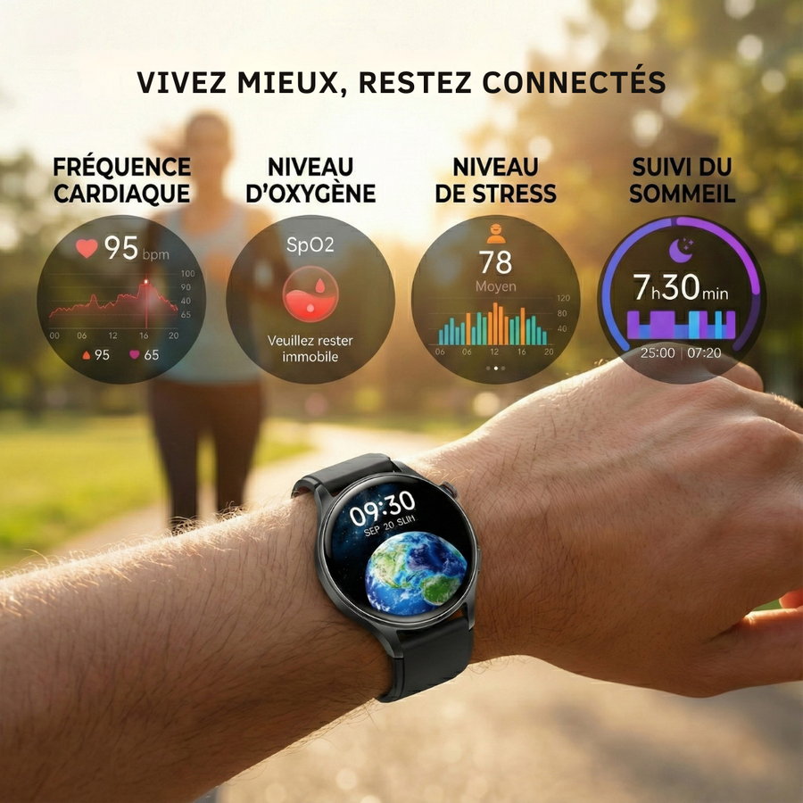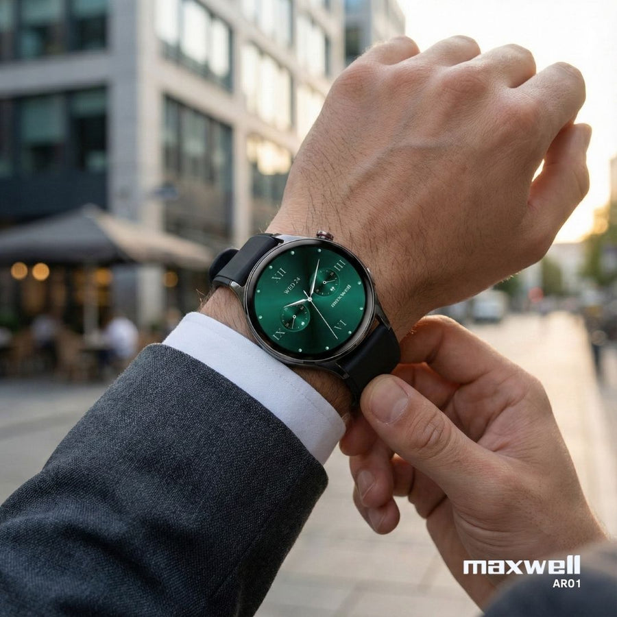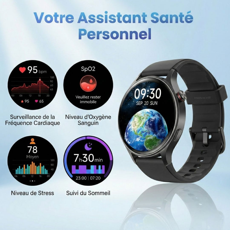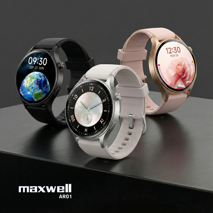 Montre Connectée AMOLED Maxwell AR01 MAX-SWR1-BK – Écran AMOLED tactile 1,3"- résolution (466 × 466) – 2ᵉ bracelet fourni : acier noir magnétique - Mode Always-On Display et cadrans personnalisables – Appels Bluetooth clairs directement depuis la montre – Notifications d’appels, messages et applications – Suivi santé complet : fréquence cardiaque, SpO₂ (oxygène sanguin), rythme respiratoire, gestion du stress, suivi menstruel – Analyse du sommeil : léger, profond et REM – Plus de 120 modes sportifs avec suivi des pas, distance et calories – Étanchéité IP68 résistante à l’eau et à la poussière – Batterie 300 mAh avec autonomie de 8 à 12 jours et charge complète en 2,5 h – Processeur : ATS3085C – G-Sensor : LSM6DS3TR-C – Capteur cardiaque PPG : HX3690S – Dimensions de la montre : 42.47 × 43.32 × 10.9 mm – Poids : 33,9 g – Compatibilité iOS (10.0+) et Android (5.0+) – Interface intuitive et configuration simple – Design moderne et confortable – Couleur : Noir – Garantie 1 an